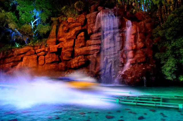 还有一个过山车是侏罗纪公园主题的,最后在被大恐龙抓住撕个粉碎和跳下瀑布粉身碎骨之间,一般人都选择先逃离恐龙的魔爪再说哈,所以最后有一个几十尺高的陡坡一冲而下,姑娘们是不怎么有胆量去坐的:
