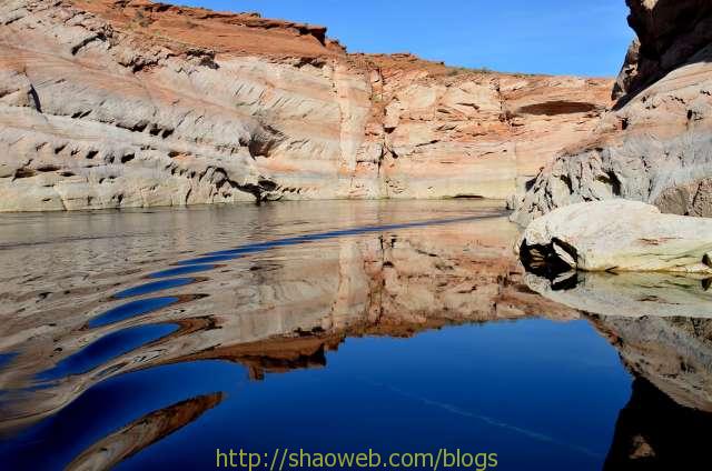 我们没有沿着主水道一直开下去,而是去看了一眼水坝,开进了羚羊峡谷(Antelop Canyon). 早上风平浪静,前面没有其他游船搅乱水面,所以我们才能看到两岸起伏连绵的多彩山石清晰的水中倒影,一路上峰回水转,美不胜收。