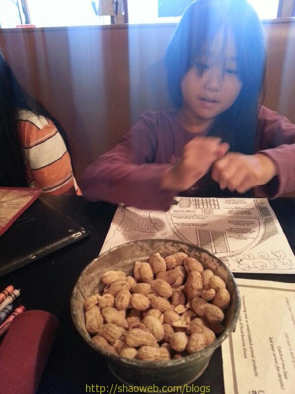 旅馆旁边是一个西部牛仔风味的餐厅,西部牛仔的装饰品,牛仔打扮的侍应生,上菜之前端上来一盘子花生,说剥完的壳可以直接扔地上,安琪对坚果过敏,安妮一个人玩得不亦乐乎。