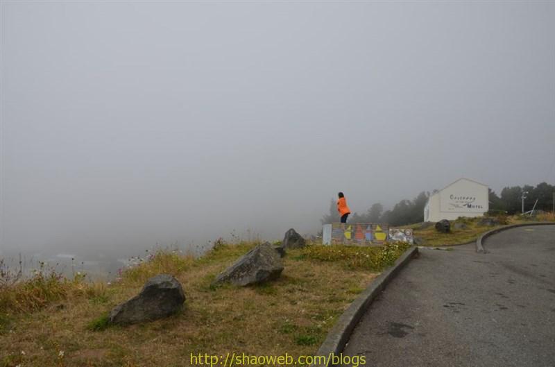 在Portorford,101拐了个弯儿,但直着的那条道上写了大大的字“beach view”,我决定去看看那个view,啥也看不见啊,白茫茫一片,雾气腾腾,风也很大。心里明白这就是大家说的雾区了,确实一路上大部分时间是雾气缭绕啊。在一个州立海边公园,安妮上厕所,安琪趁机去了一趟沙滩,风吹得冷飕飕的。