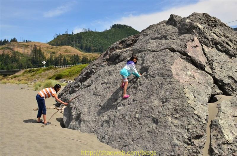 刚玩了Gold beach,我们商量着不能再玩beach了,需要多赶路,一转弯就看见一个大beach,竖着几个大礁石,太诱人了,MeyersCreek beach,按孩子们的话说,这是目前为止她们最喜欢的沙滩,有沙子,有海生物,有浪,有木头,嗯,是很不错,还有镇市的大“海龟”。“That’sour favorite beach so far”这句话,她们也说了好多遍。