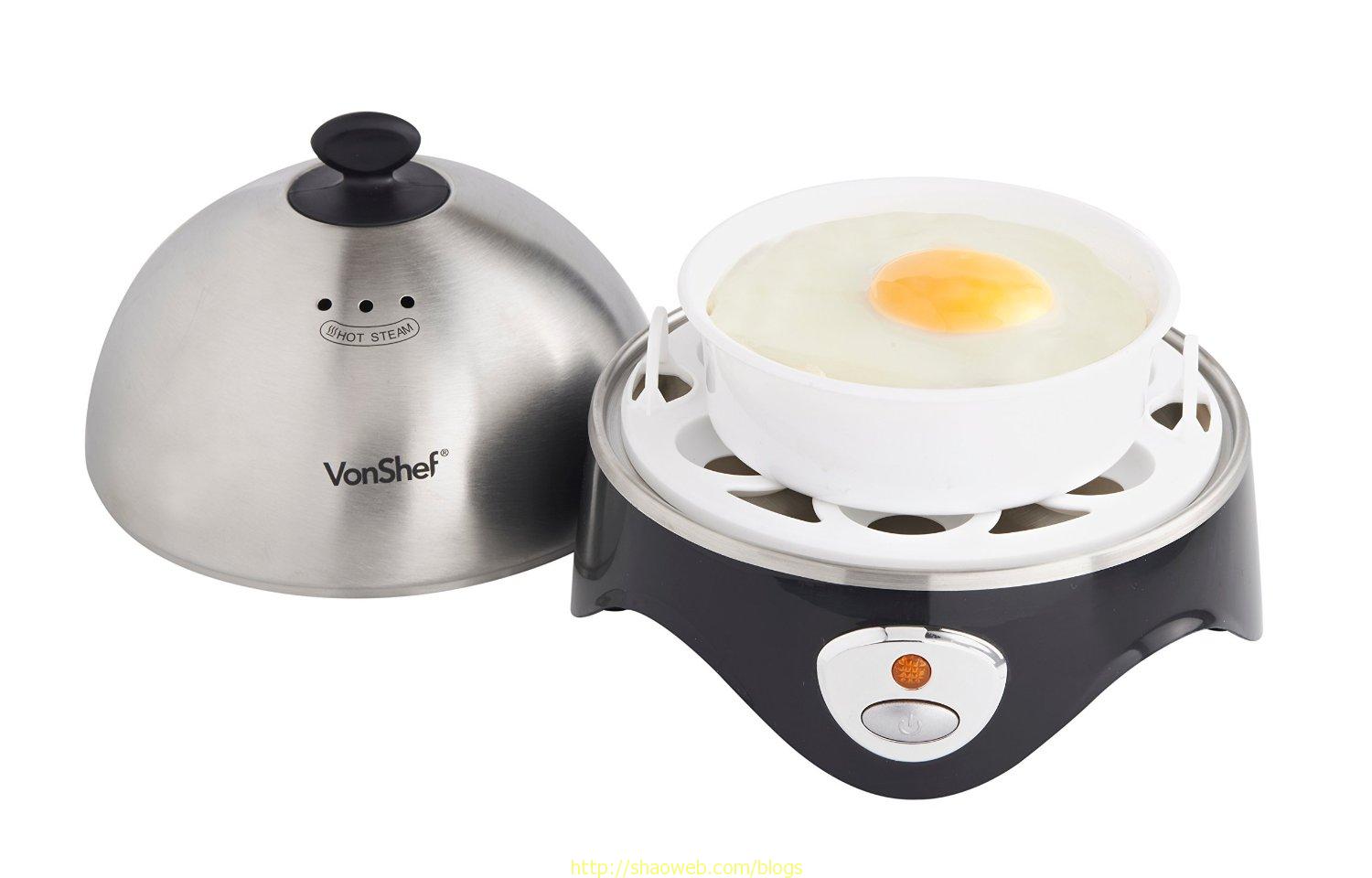 为了防止蛋破,还可以预先用水量杯下的针头在大头部位打个小眼,我看朋友煮了好多次都没打眼,早上我也懒得打小眼了,还真有一个破了,害得我第一次用就要清洗粘在下面锅里的鸡蛋清,好在不是特别难清洗。