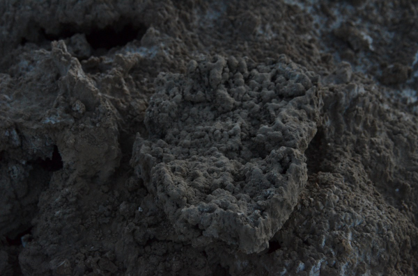 里面一大片白花花的,看着像水面,走过去一看是这样的硼砂,薄薄的一层,估计水多的时候像泡沫一样飘在水面,水干了以后,就附在岩石泥土上了: