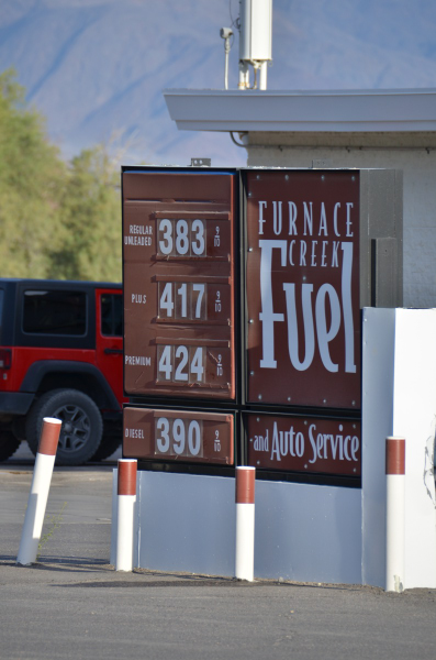 相对于5号公路上三块几一加仑的油价,死谷内将近4块的油价来说,谷内小镇上的油价一点儿都不贵: