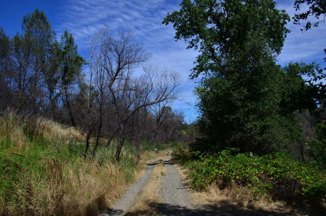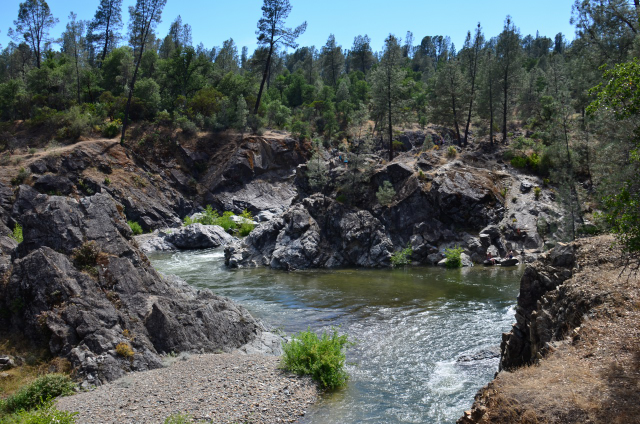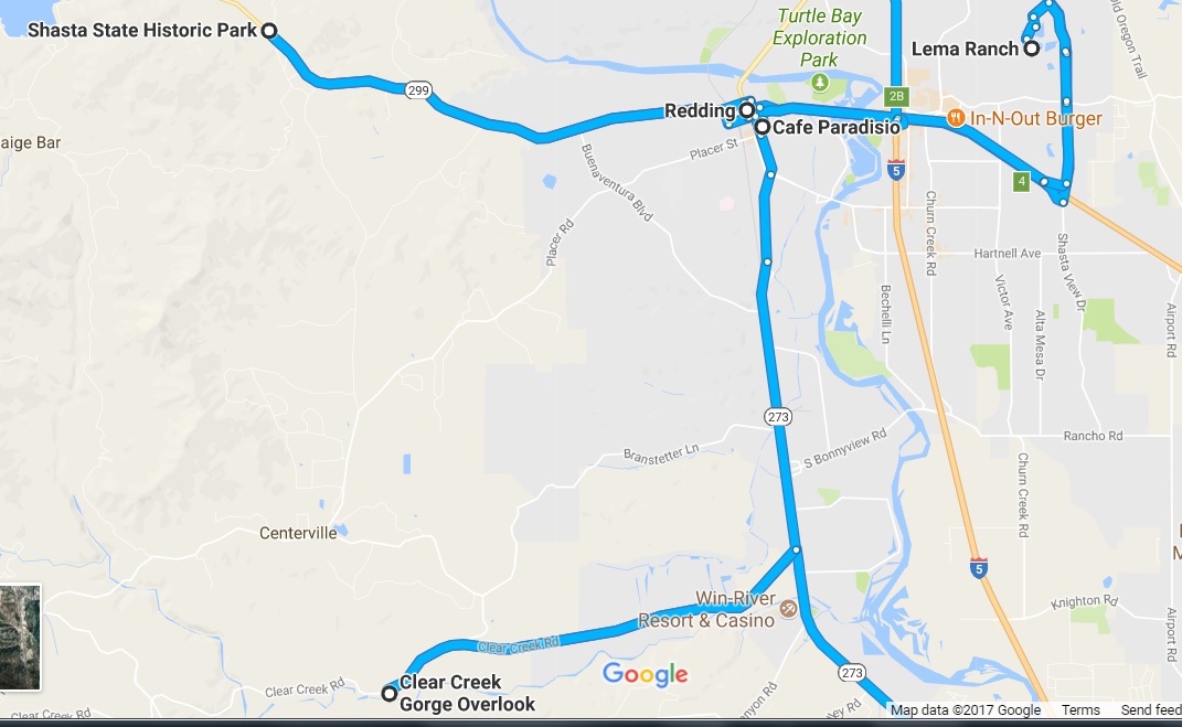 我们把第一天的目的地定在Redding,路上找了个高速路上的休息区,埋灶做午饭,煮的是方便面加青菜,吃了点水果。吃饭的时候用手机上的TripAdvisor研究了一下附近有什么好玩的,最后选择了Clear creek trail。